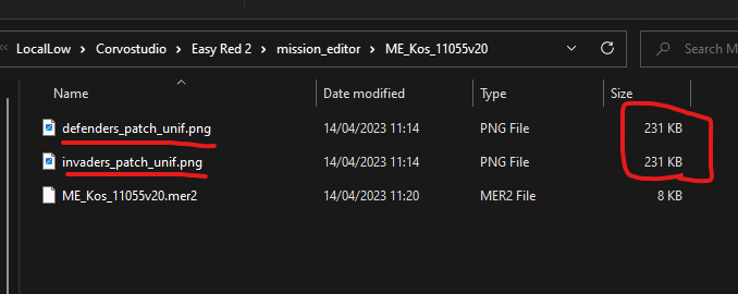 To do so, simply place the patch images as png file in the mission folder with the names "defenders_patch_unif.png" and "invaders_patch_unif.png". Make sure the files are small in size, and the image resolution shouldn't be larger that 256x256 (if bigger it will be rescaled so bigger images would be a waste of space).