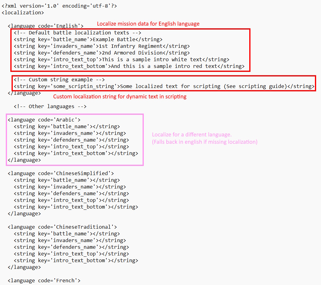 It is possible to personalize mission Intro and localize mission name and batalion names using the localization file.